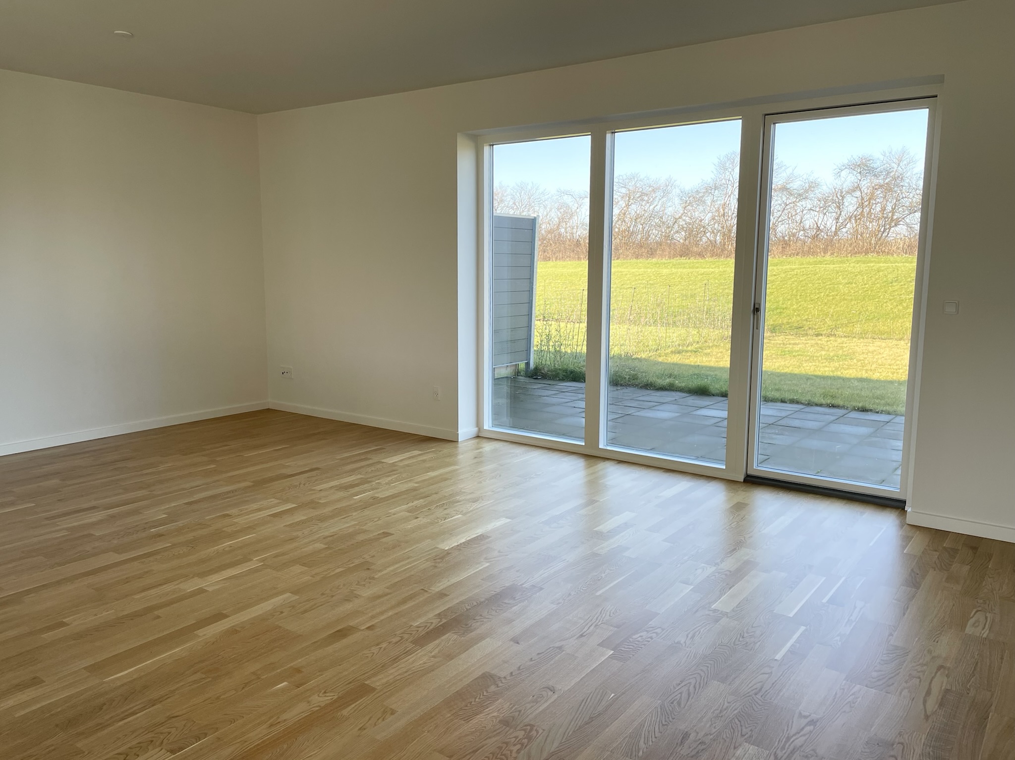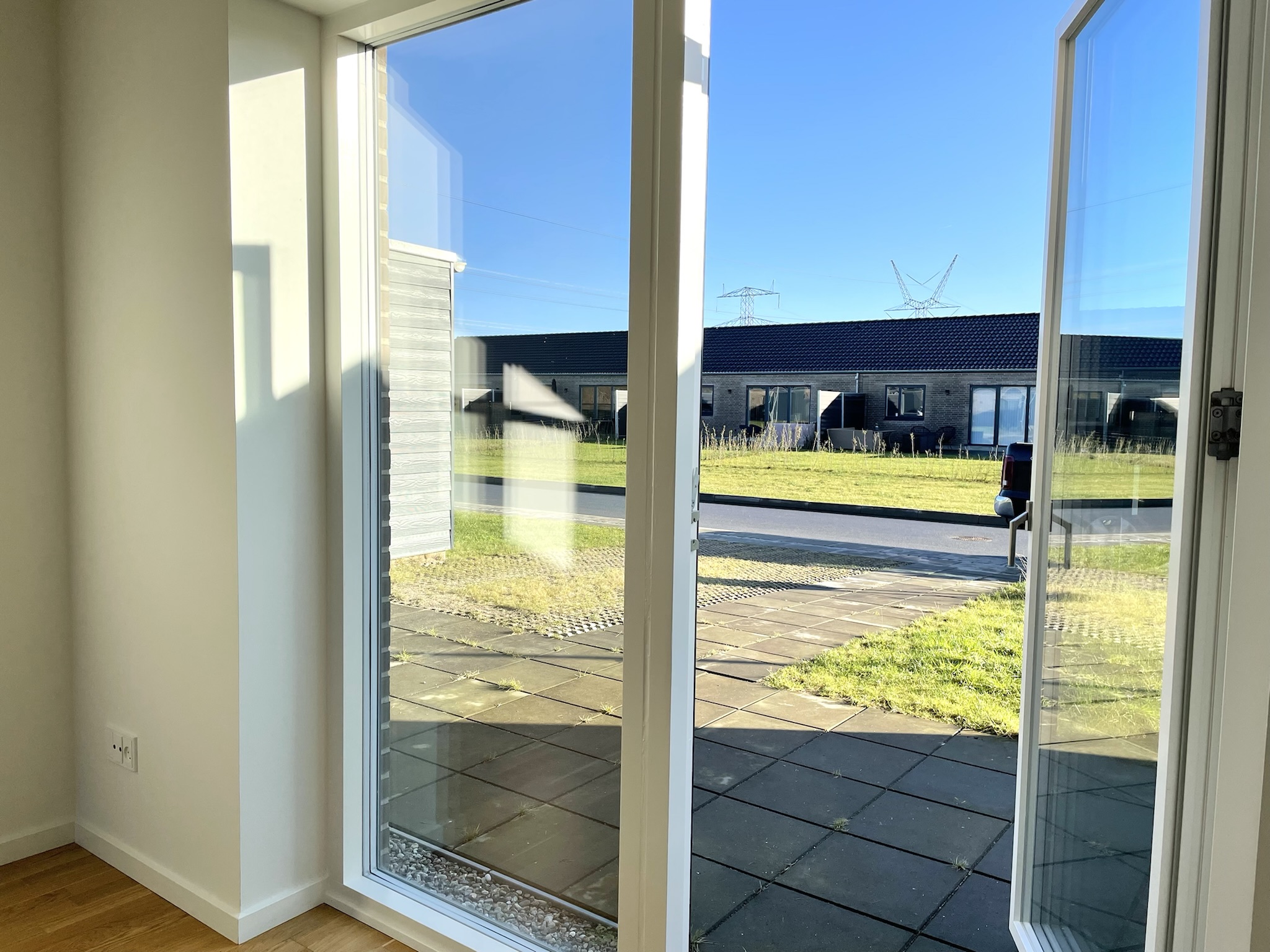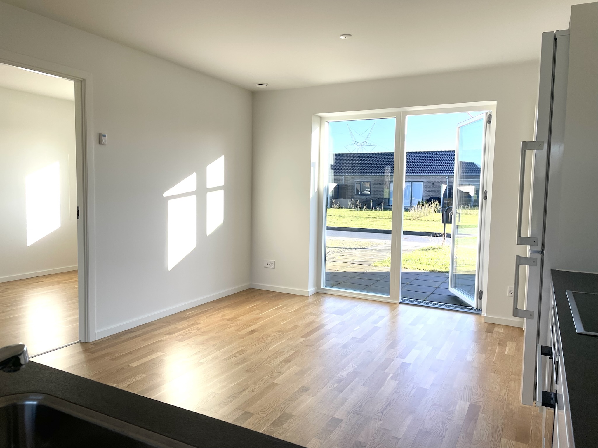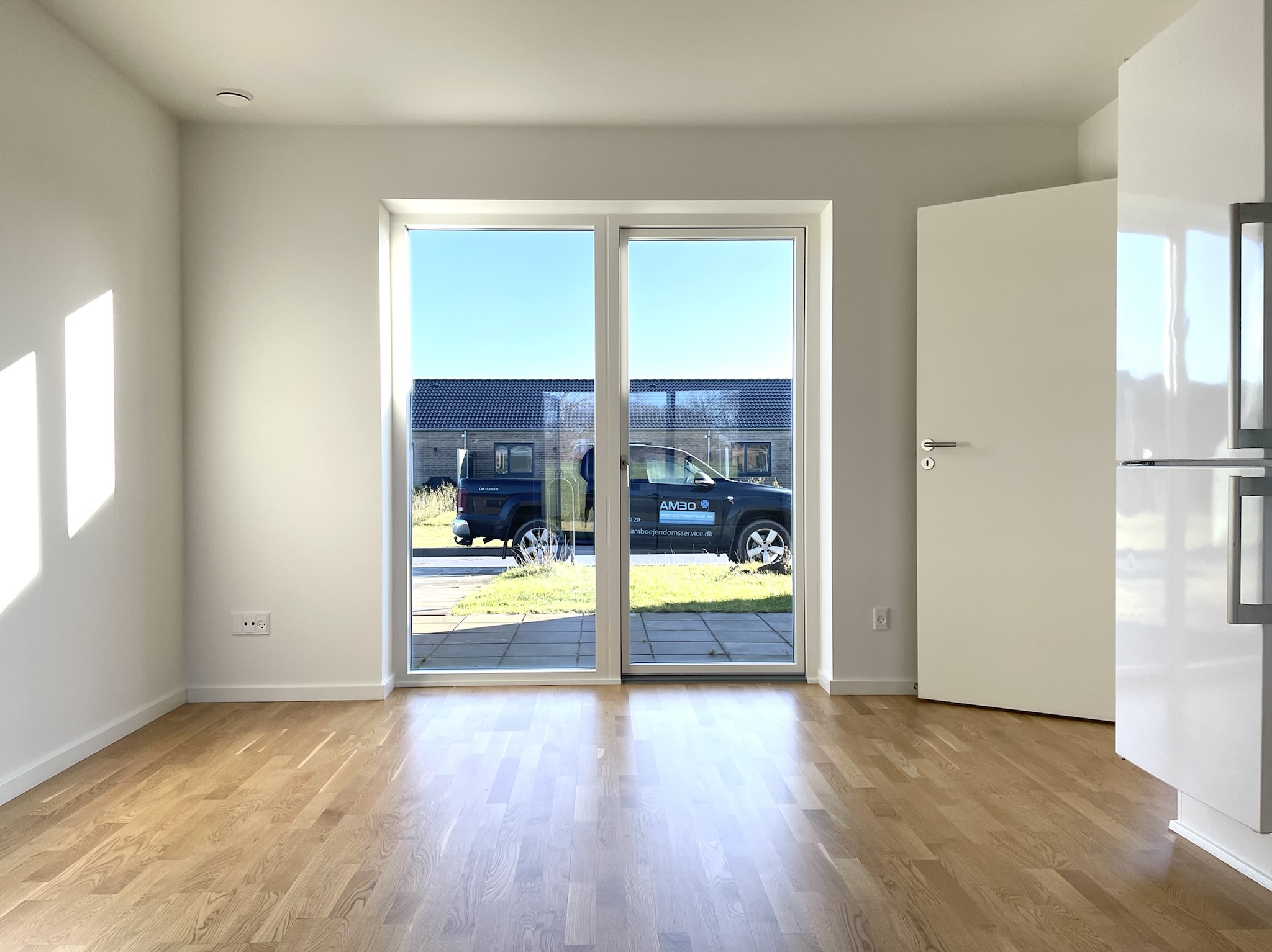 Alle rækkehusene har trægulve, hvidt HTH-køkken samt skur, indkørsel og egen haven med græs og terrasse.